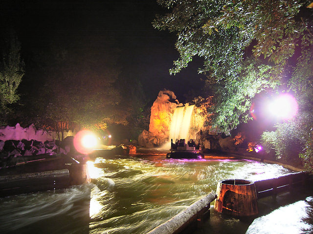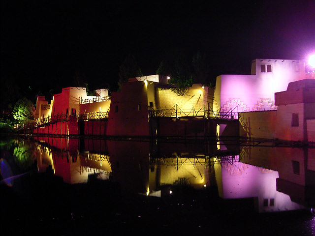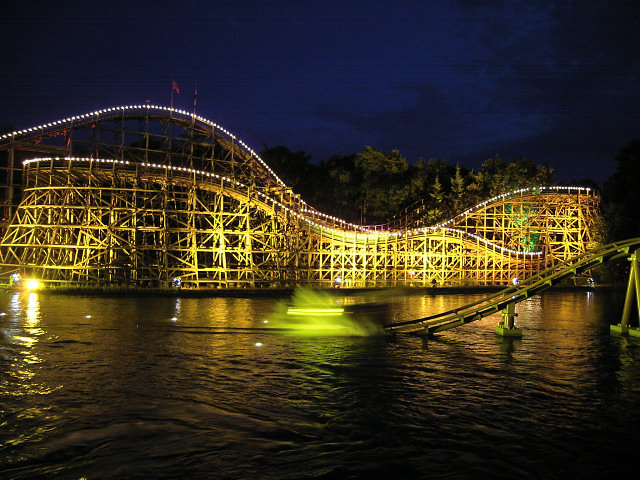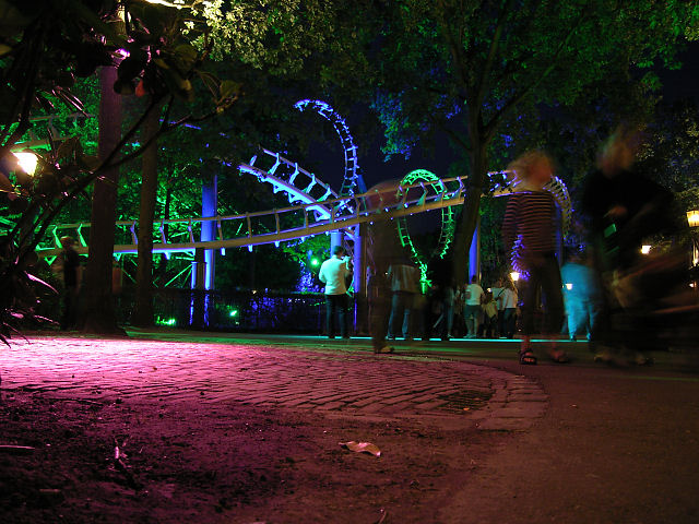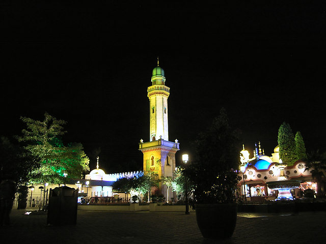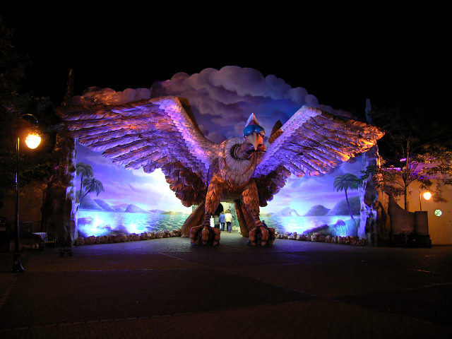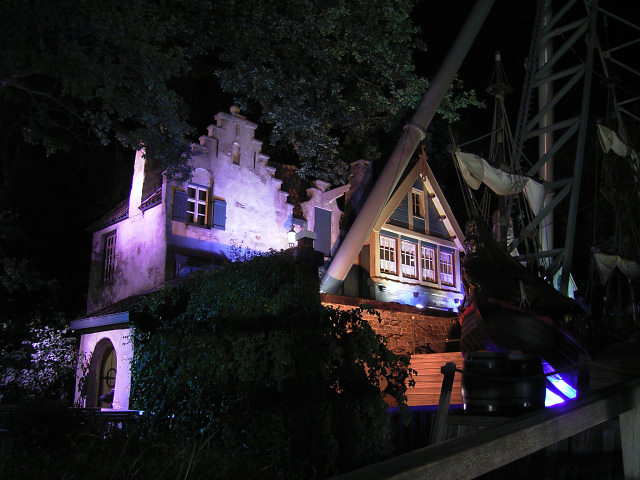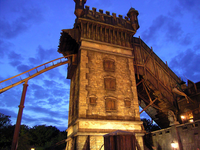 Die im Hintergrund angeleuchtete Holzachterbahn Pegasus wurde am 11. August 2009 abgerissen. Die Attraktion unterlag einem erhöhten Verschleiß und erforderte immer höhere Wartungskosten. Im März wurde die Bahn noch vom TÜV abgenommen - aber das Fahrerlebnis erfüllte nicht mehr die Vorgaben von Efteling. Seit Mitte 2010 ist dort die Doppel Holzachterbahn Joris en de Draak in Betrieb. siehe YouTube-Video |